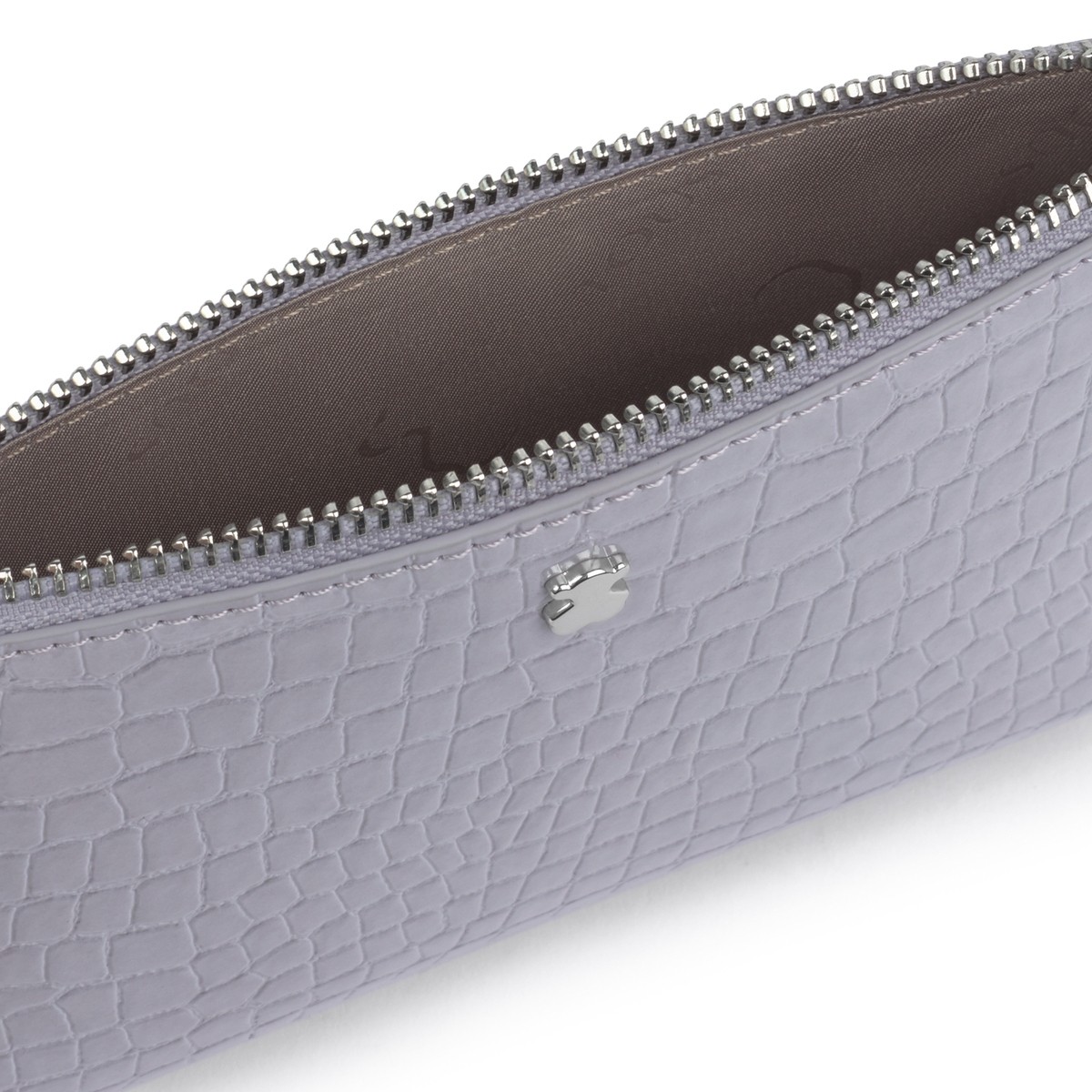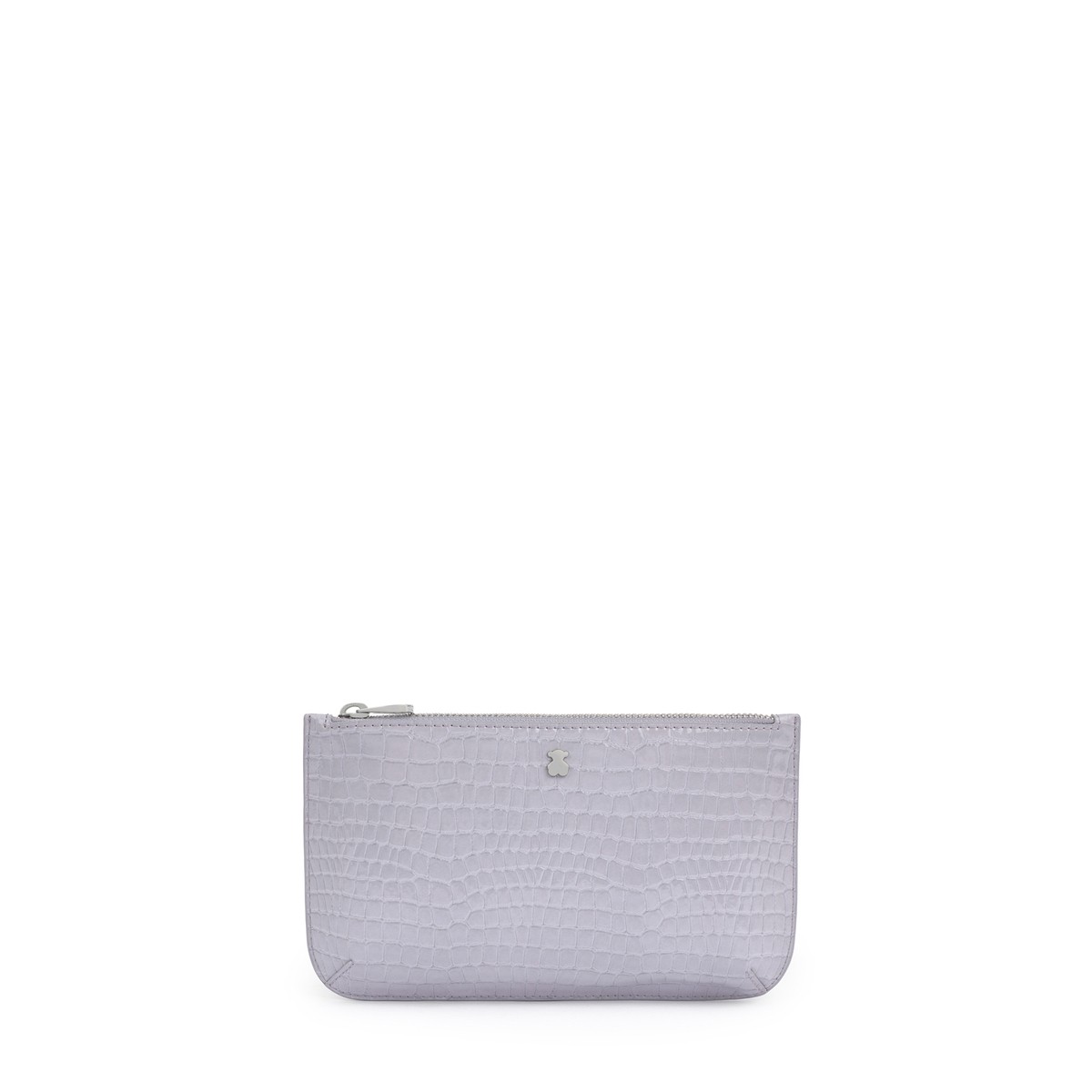 Neceser plano TOUS colección Dorp de vinilo efecto piel con acabado piel exótica en color lila. Apliques personalizados en tono plata. Cierre con cremallera. Medidas: 13 x 21 x 1,5 cm.