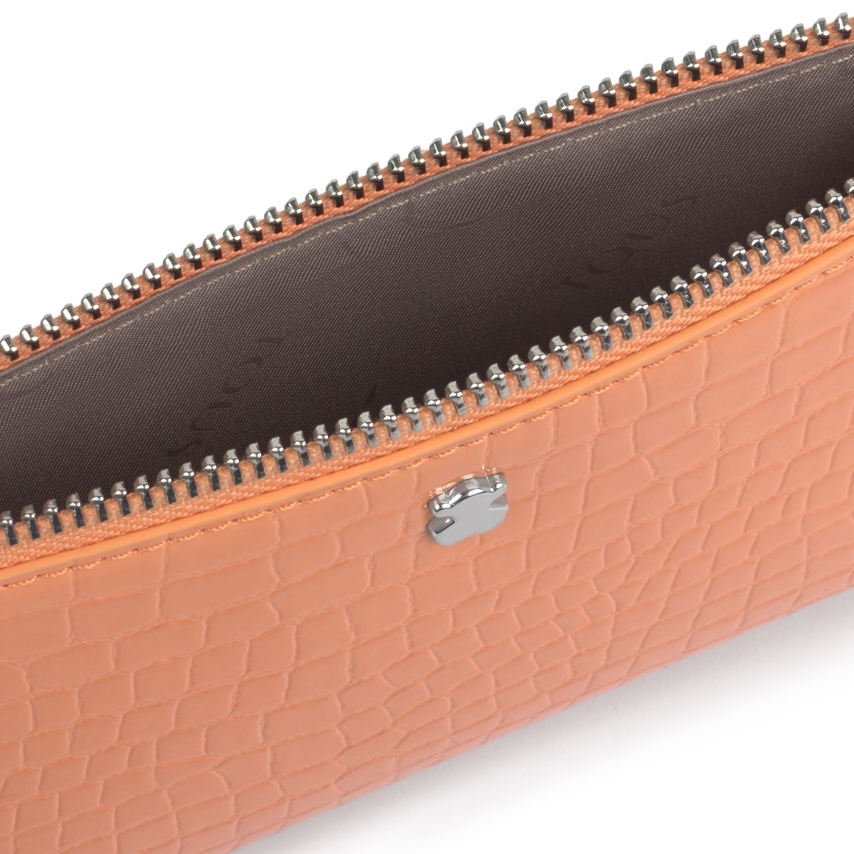 Neceser plano TOUS colección Dorp de vinilo efecto piel con acabado piel exótica en color naranja. Apliques personalizados en tono plata. Medidas: 13 x 21 x 1,5 cm.