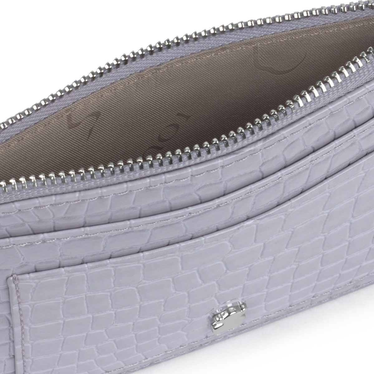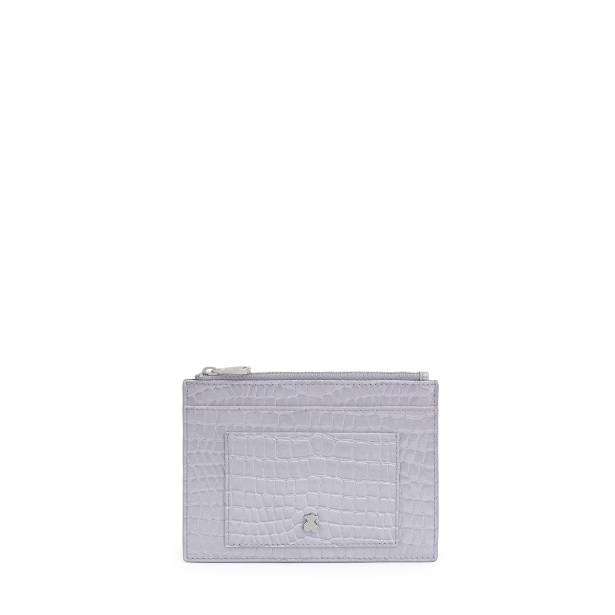 Neceser plano TOUS colección Dorp de vinilo efecto piel con acabado piel exótica en color lila. Cierre con cremallera. Apliques personalizados en tono plata. Cuatro compartimentos para tarjetas y seis compartimentos planos. Medidas: 11,5 x15,7x 1 cm.