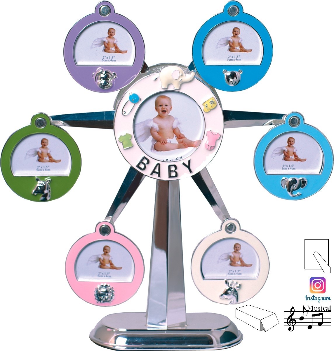 NORIA MUSICAL INFANTIL Ref. 09352.PLATEADA CON 7.FOTOS PLATEADO Y ESMALTADO 6 FOTOS DE 5X4cm 1 FOTO DE 6,5X6,5cm