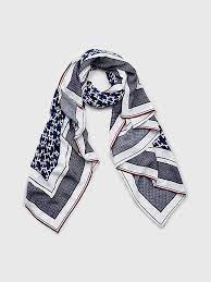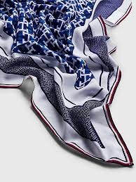 pañuelo cuadrado de inspiración náutica, ideal para añadir un toque vistoso a cualquier conjunto, está confeccionado en satén y luce un estampado integral del monograma TH.