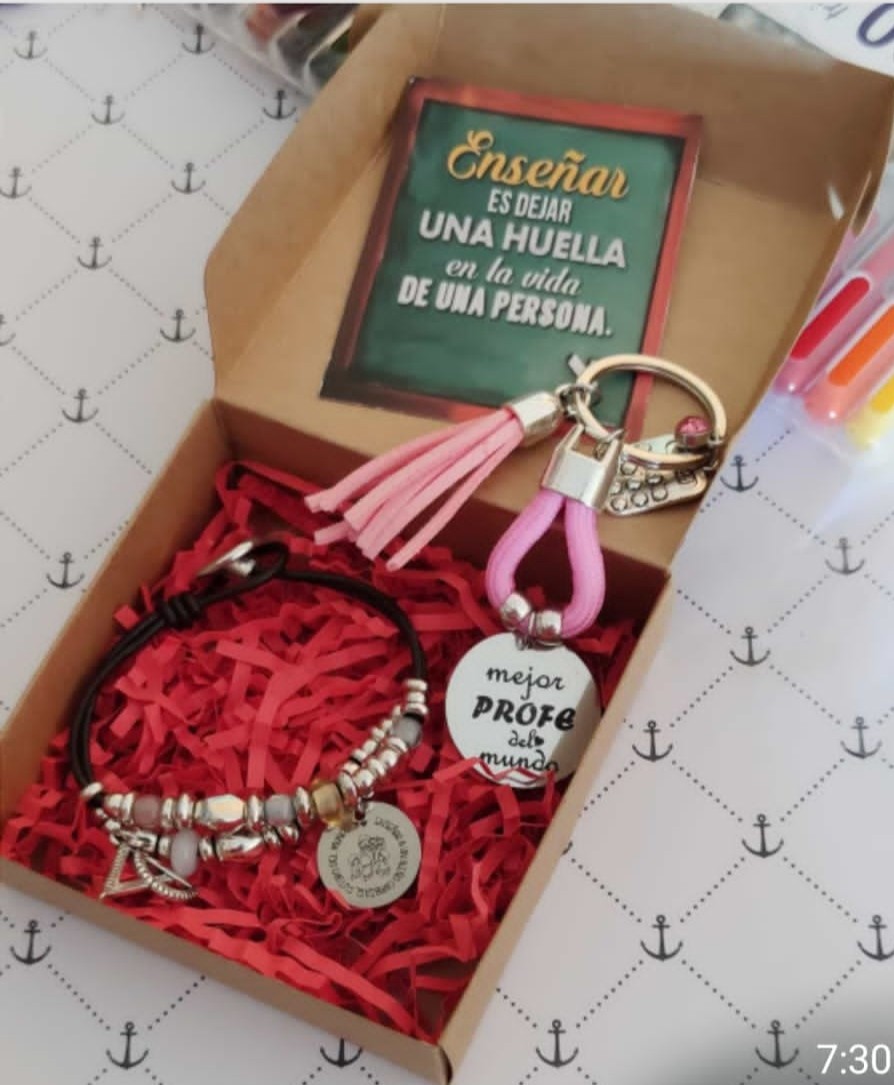 PACK PROFESORA CON PULSERA DE CUERO MARRON Y LLAVERO DE CORDON EN ROSA PARA MAESTRA