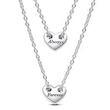 Gargantilla Pandora Doble Divisible Para Siempre para mujer de la colección Día de la Madre 2024 fabricada en plata de primera ley compuesta por una doble gargantilla, ambas acabadas en un colgante en forma de corazón con los grabados "Always" y "forever".