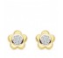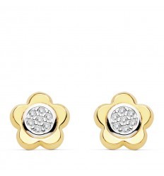 Pendientes de mujer en oro bicolor de 1ª ley 18 kilates (750 milésimas). Pendientes con forma flores y panel de circonitas en oro blanco. Miden 10mm y tienen acabado en brillo y cierre presión. Pendientes ideales para tu outfit de diario. Todas nuestras joyas se envían con estuche que te enamorará.