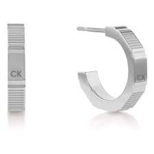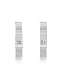 Pendientes de aro plateados de acero inoxidable Calvin Klein Essential Shapes con el logo CK. Los pendientes miden 15,5 mm de diámetro, 3 mm de ancho y 2 mm de alto.