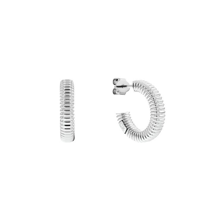 Pendientes Calvin Klein para mujer de la colección Playful Repatition fabricados en acero inoxidable plateado en forma de aro texturizado con la inscripción "C K". Su cierre es de presión.
