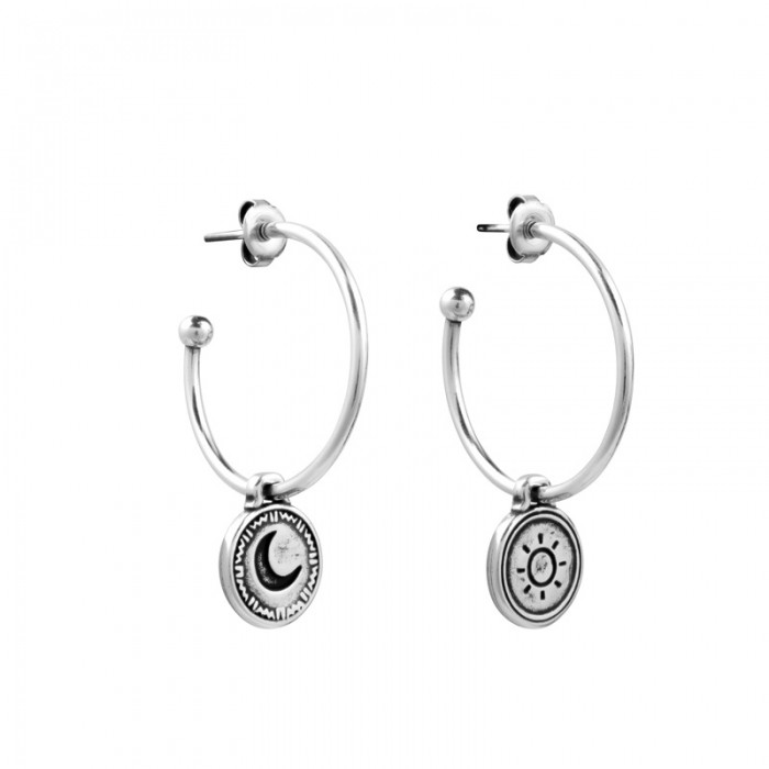 Pendientes de aro de 20mm con charms colgantes de sol y luna de la colección Eclipse. El conjunto completo mide 35mm. El cierre es a presión.