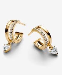 Pendientes Pandora Aro Shine Corazón 263685C01: Acabados con recubrimiento de oro de 14k, estos pendientes se presentan con dos bandas, una pulida y otra banda decorada con circonitas cúbicas. Este diseño se ha rematado con gemas con forma de corazón colgando de la banda pulida de ambos pendientes. El cierre de mariposa garantiza un uso cómodo y seguro.