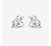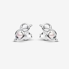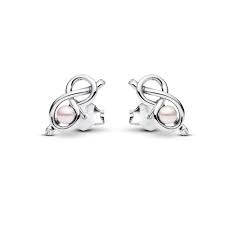 pendientes de botón Nudo Infinito. Estos pendientes de plata de ley lucen perlas artificiales lacadas en rosa, engastadas en símbolos de nudo infinito, con brillantes piedras en cada extremo. Elegantes e irreverentes, las perlas rosas aportan el color justo para animar cualquier look, pero también pueden funcionar como un versátil tono neutro