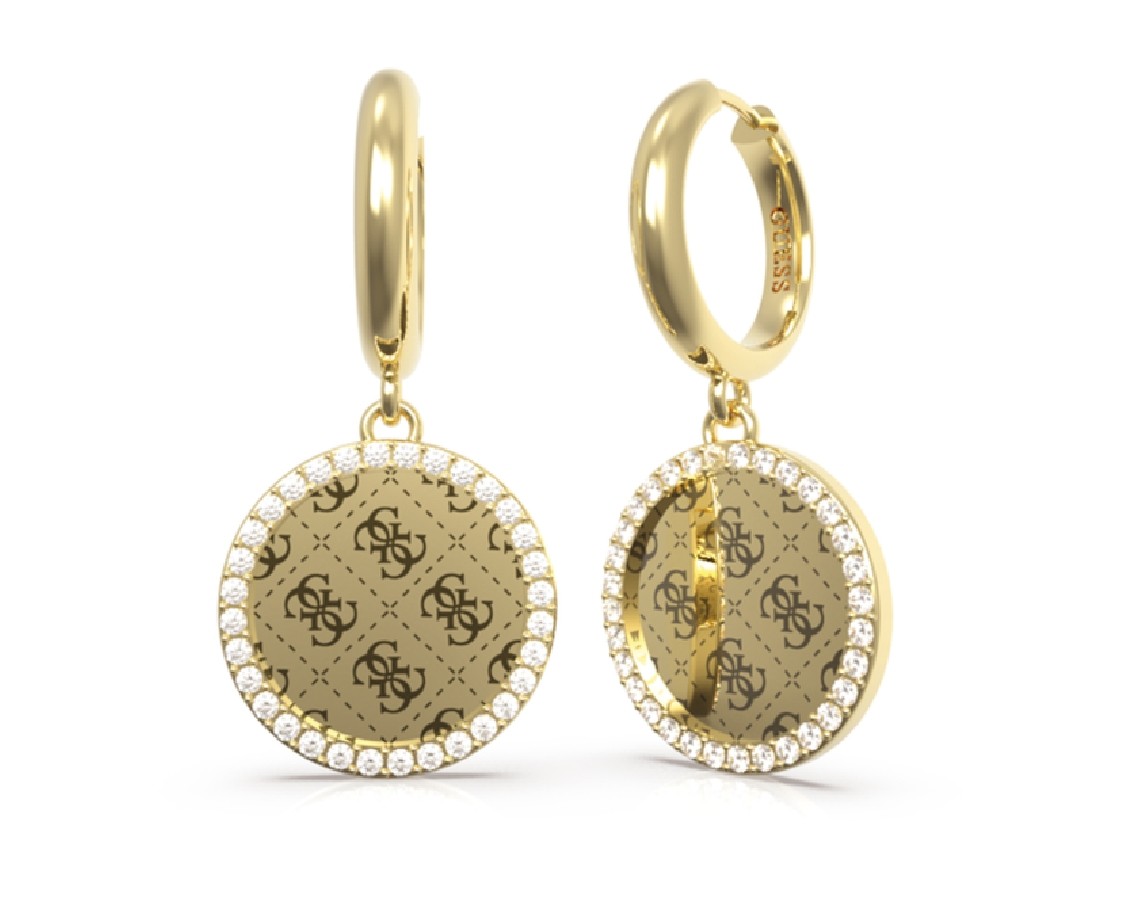 Estos pendientes Guess JUBE01158JWYGT-U Round Harmony orientados para mujer, son de acero dorado, en forma de huggies con icono de las 4G's rodeado de pedrería colgando.