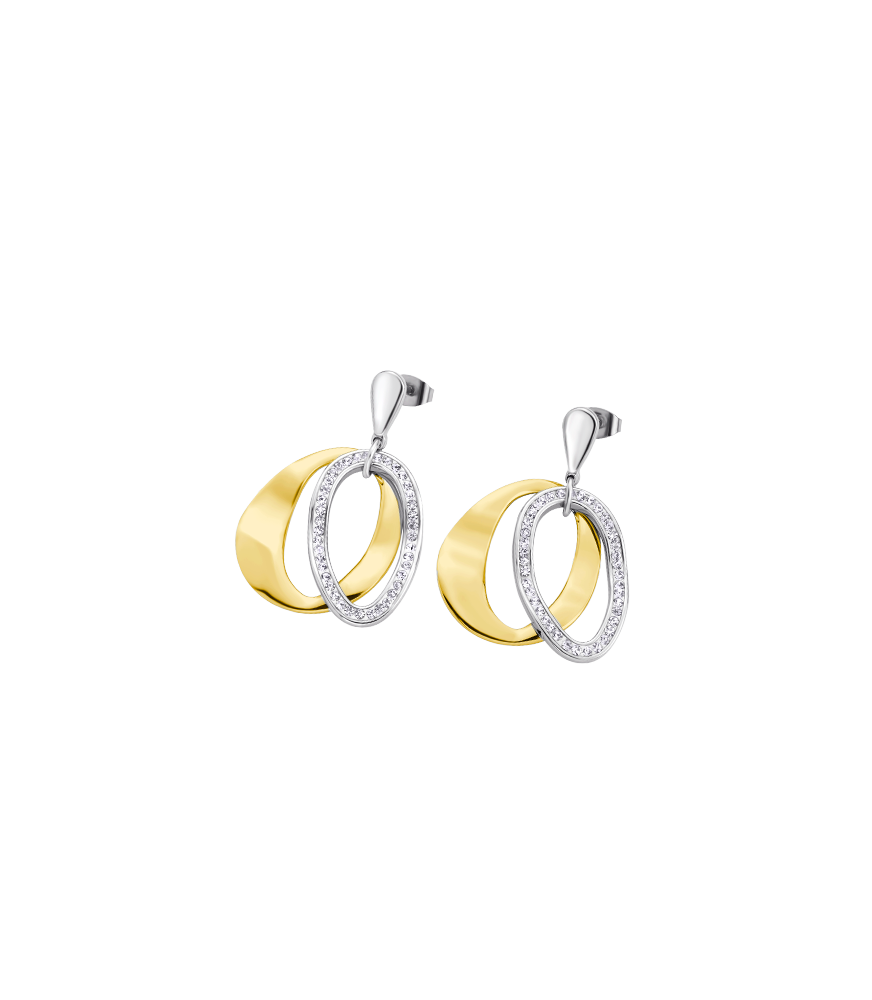 Pendientes Lotus Style LS1672/4/2 en acero inoxidable 316L, con motivos ovalados combinando piezas con circonitas y otras con acabado brillante chapados en roro amarillo.