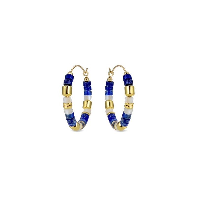 Pendientes de plata de ley 925 chapados en oro amarillo. Aro de 30mm de diámetro con cilindros de lapislázuli y nácar. grosor de 4mm. Cierre de palanca.