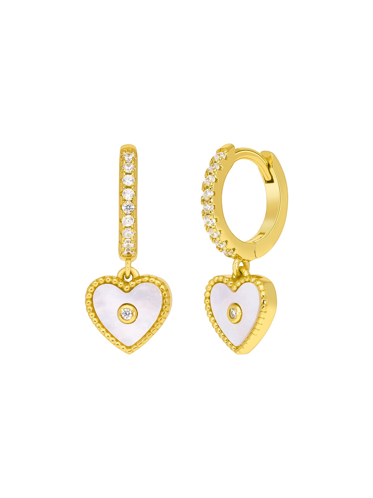 Pendiente hoop corazón. Plata de 1ª Ley baño en oro de 18k. Nácar natural. Circonita central en bocel y microengaste. Cierre huggy. Colección Valentine.