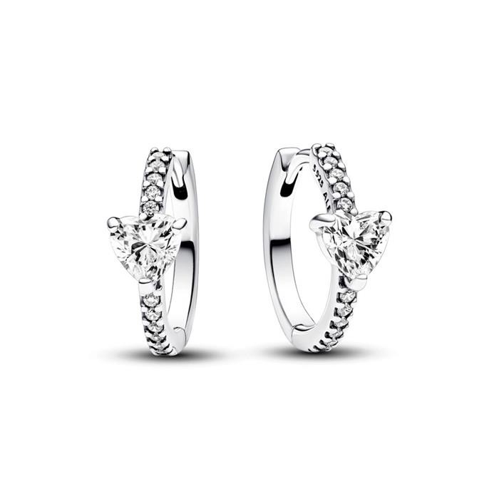 Pendientes Pandora para mujer en forma de aro de la colección San Valentín 2024 fabricados en plata de primera ley compuestos por circonitas brillantes y una circonita cúbica central en forma de corazón. Su cierre es de criolla.