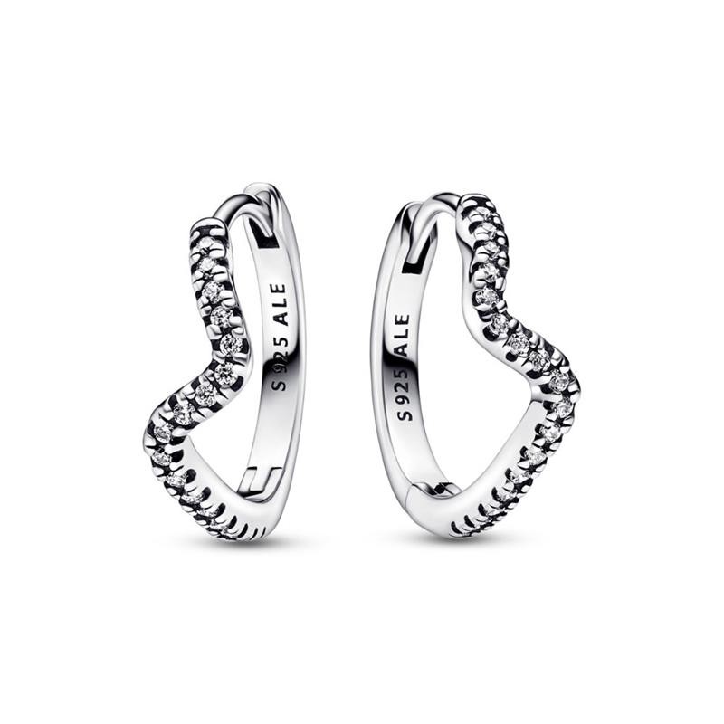 Pendientes Pandora Ola Brillante para mujer fabricados en plata en forma de aro ondulado compuesto por circonitas brillantes. Su cierre es de criolla.