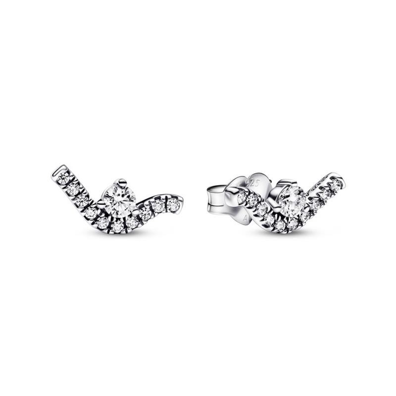 Pendientes Pandora Olas Brillantes para mujer fabricados en plata de primera ley en forma ondulado de tipo botón compuestos por circonitas brillantes. Su cierre es de presión.