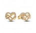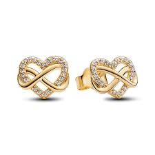 Pendientes Pandora Corazón Infinito Brillante para mujer de la colección Día de la Madre 2024 fabricados en aleación de metales bañados en oro amarillo de 14Kt de diseño tipo botón en forma de corazón compuesto por circonitas blancas con un infinito entrelazado. Su cierre es de presión.