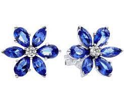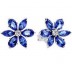 Material: Plata de primera ley. Piedras: circonitas cúbicas transparentes redondas, y cristales artificiales azules facetados en forma de pera y marquesa. Cierre: Presión.