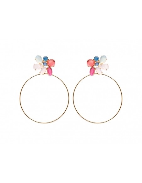 Acabado: Brass con Baño en Oro de 18k Piedras: Base de Nácar y cristales de colores Diámetro interior del aro: 5 cm Peso: 4.5 g