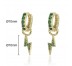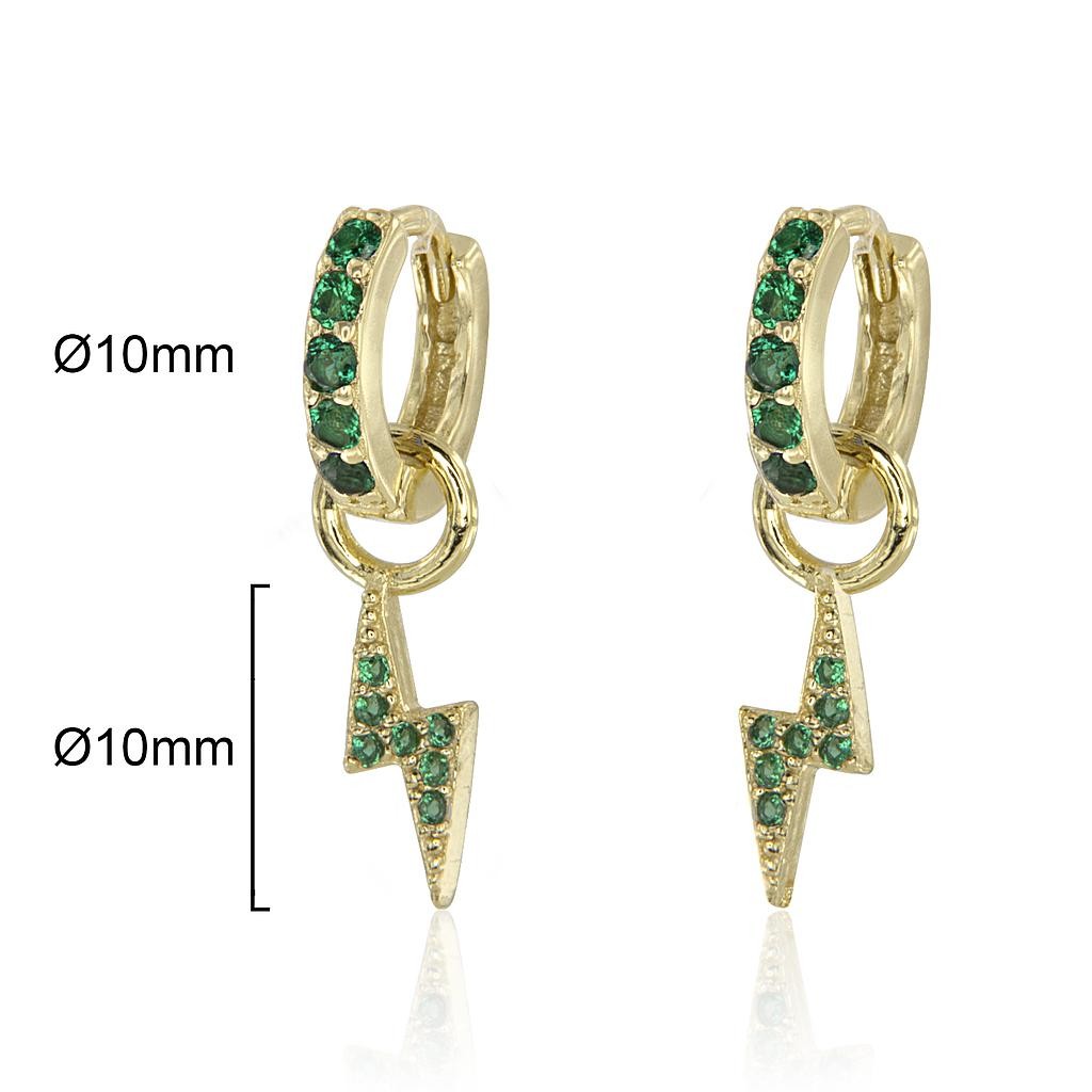 Pendiente en plata chapado color dorado tipo argolla de 10 mm de diámetro y rayo colgante de 10 mm de longitud con circonitas de color verde