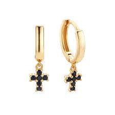 PENDIENTES PLATA DORADA ARO CRUZ CIRCONITAS NEGRAS 00510613