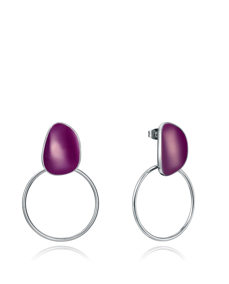 Pendientes Viceroy Air de acero y diseño compuesto de dos piezas: superior plana ovalada (15mm x 20mm) irregular con esmalte de color morado y un aro de 28 mm diámetro. Cierre a presión y 4,5 cm de largo
