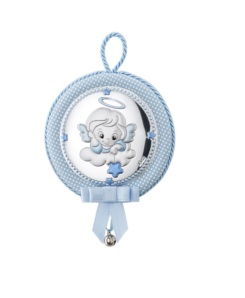 PLACA DE CUNA MUSICAL REDONDA EN COLOR AZUL CON CASCABEL Y ANGEL DE LA GUARDA 11CMS