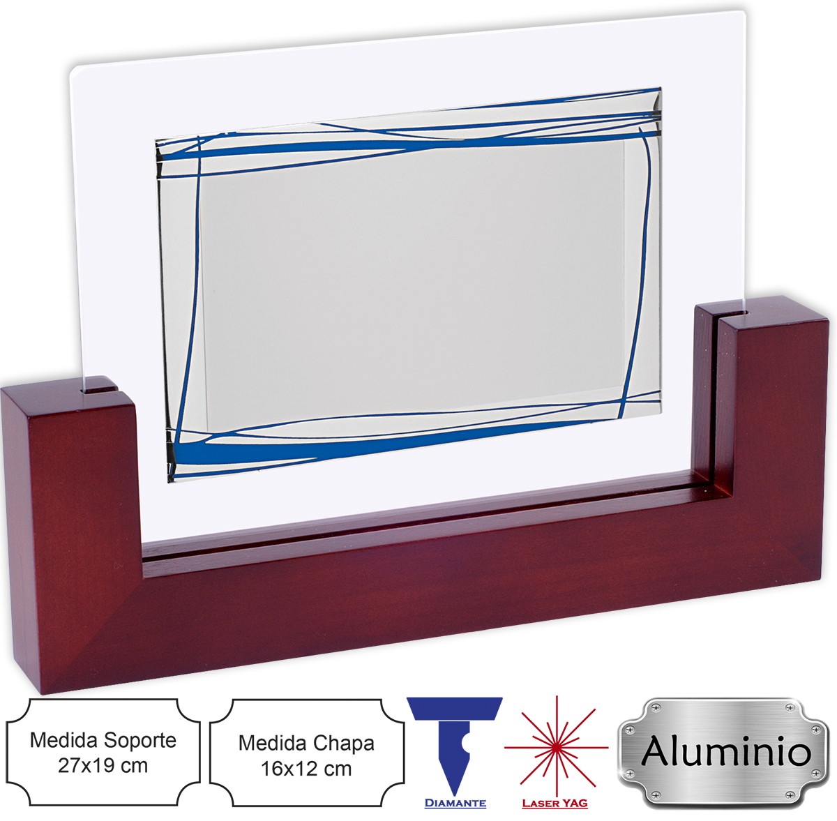 PLACA HOMENAJE CON BASE DE MADERA CRISTAL Y CHAPA DE ALUMINIO Medida base 27x19cm Medida chapa aluminio 16x12cm