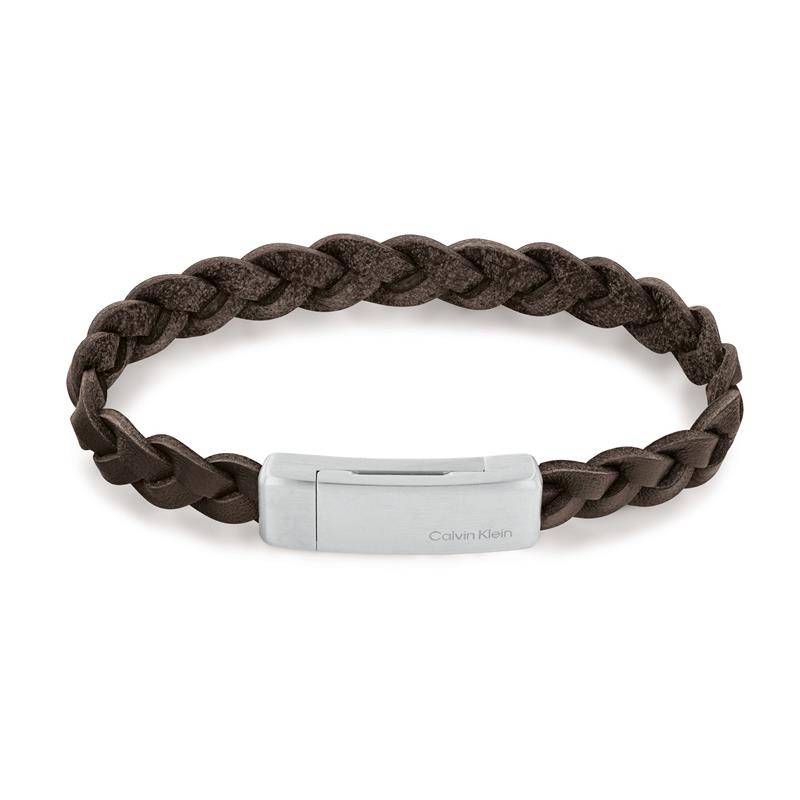 Pulsera Calvin Klein para hombre de la colección Braided fabricada en cuero marrón trenzado y cierre magnético de acero inoxidable con la inscripción del logo Calvin Klein