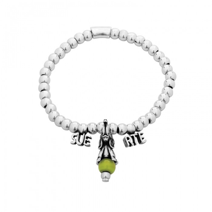 Pulsera de la suerte con bolitas de metal bañada en plata , con piedra en color y motivo de elefante. Una pieza diseñada y fabricada por Ciclón de forma artesanal en España.