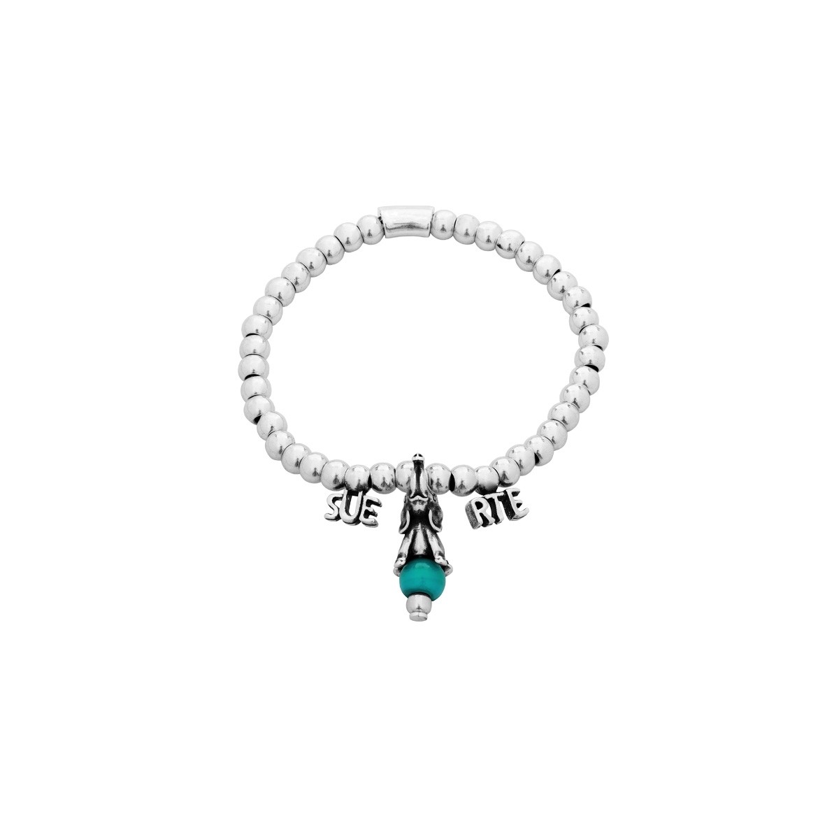 Pulsera de la suerte con bolitas de metal bañada en plata , con piedra en color y motivo de elefante. Una pieza diseñada y fabricada por Ciclón de forma artesanal en España.