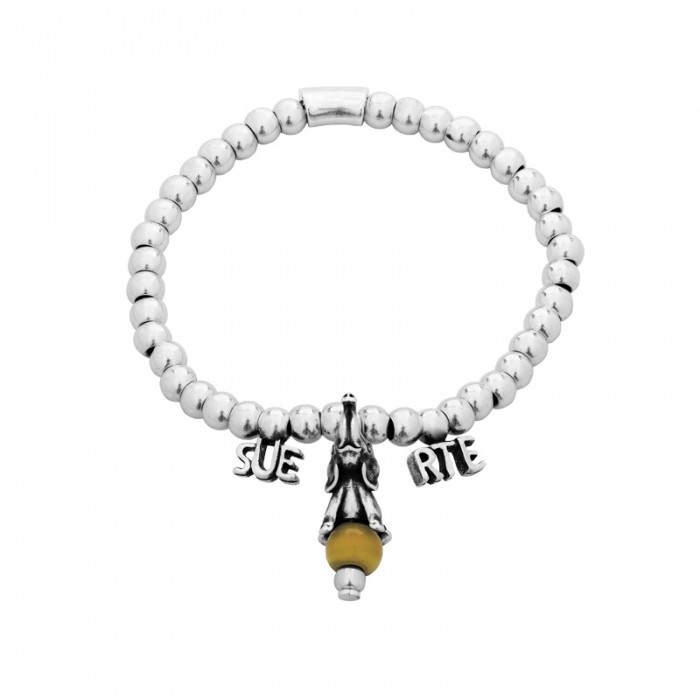 Pulsera de la suerte con bolitas de metal bañada en plata , con piedra en color y motivo de elefante. Una pieza diseñada y fabricada por Ciclón de forma artesanal en España.