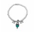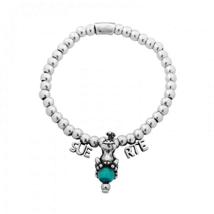 Pulsera de la suerte con bolitas de metal bañada en plata , con piedra en color y motivo de rana. Una pieza diseñada y fabricada por Ciclón de forma artesanal en España
