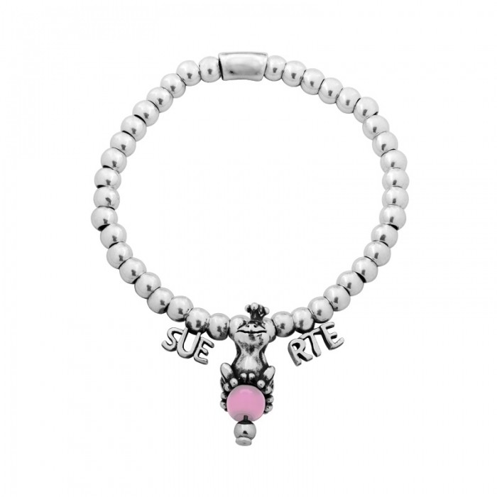 Pulsera de la suerte con bolitas de metal bañada en plata , con piedra en color y motivo de rana. Una pieza diseñada y fabricada por Ciclón de forma artesanal en España
