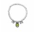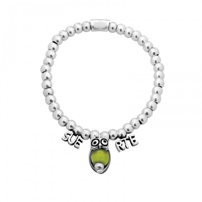 Pulsera de la suerte con bolitas de metal bañada en plata , con piedra en color y motivo de búho. Una pieza diseñada y fabricada por Ciclón de forma artesanal en España.