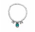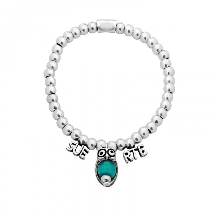Pulsera de la suerte con bolitas de metal bañada en plata , con piedra en color y motivo de búho. Una pieza diseñada y fabricada por Ciclón de forma artesanal en España.