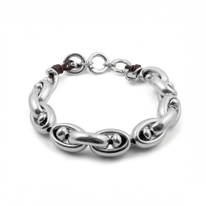 Pulsera Unión ciclon de cuentas de metal bañadas en plata montada sobre cuero, diseñada para colección DISCOLA. Un original e innovador diseño con toda la personalidad de Ciclón hecho de manera artesanal