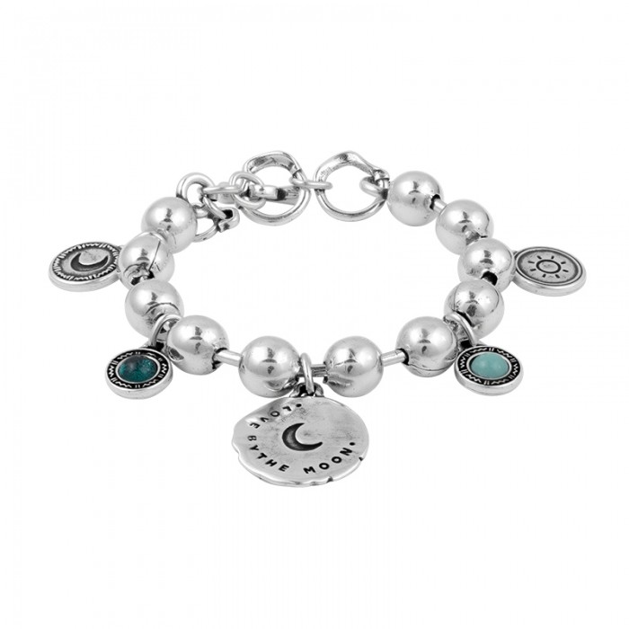 Pulsera de bolitas reversible, con inscripciones Love by the moon y Live by the sun de la colección Eclipse. Los charms llevan motivos de sol y luna y piedras en color de cristal murano.