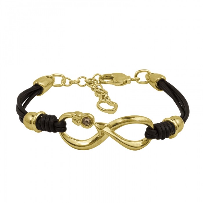 Pulsera Eterno con cuero y símbolo infinito v decorado con un pequeño cristal checo en color ámbar de la colección Fleterna. Cierre de mosquetón con talla única de 16 a 20cm.