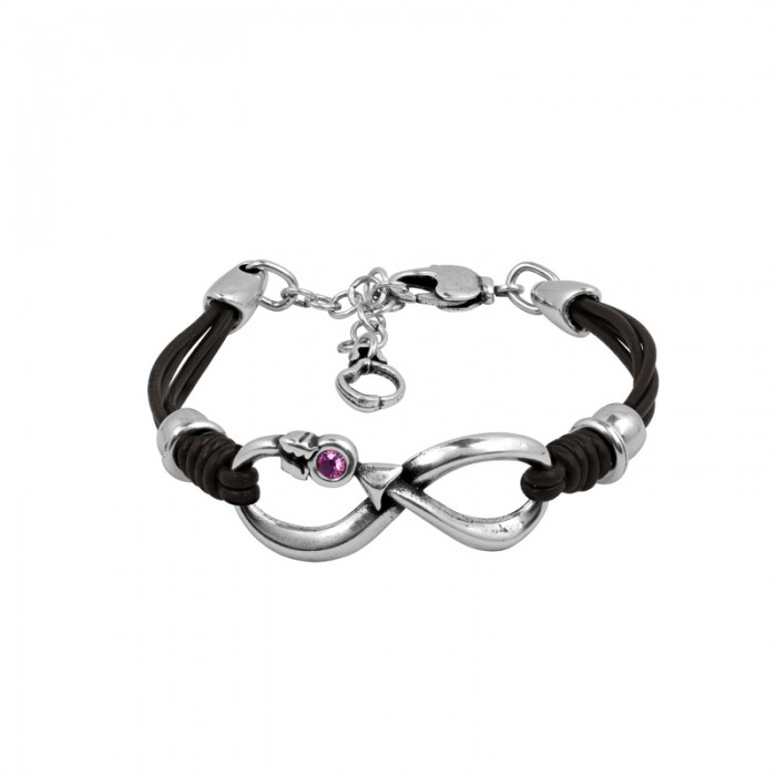 Pulsera con cuero y símbolo infinito decorado con un pequeño cristal checo fucsia de la colección Fleterna.