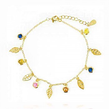 PULSERA DE PLATA CHAPADA CON HOJAS Y CIRCONITAS DE COLORES