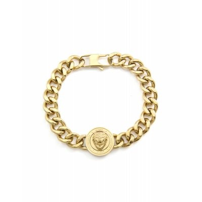 Pulsera Guess Lion King JUMB01314JWYGS para hombre, en acero inoxidable con chapado dorado. Pulsera cadena con charm cabeza de león.