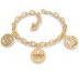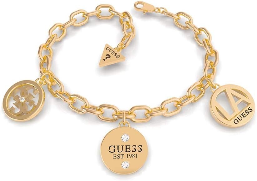 Pulsera Guess L.A. UBB79051-S acero inoxidable chapada oro tres colgantes logo cristales Swarovski. Diámetro colgantes: 6mm.. Mujer. Tipo cierre: Mosquetón.