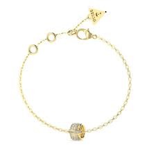 Pulsera Guess para mujer de la colección Fabulous Me fabricada en acero inoxidable baño oro compuesta por una finay elegante cadena que contiene un abalorio compuesto por cristales brillantes. Su cierre es de mosquetón ajustable mediante cadena extensible.