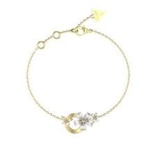 Pulsera Guess para mujer de la colección Lily fabricad en acero bañado en oro amarillo compeusta por una fina y elegante cadena que cuenta en su parte central con un abalorio circular con el grabado "GUESS" y una flor compuesta por cristales brillantes. Su cierre es de mosquetón ajustable mediante cadena extensible.