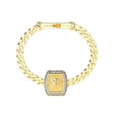 Pulsera Guess Lion King de hombre en acero IP dorado decorada con cristales en color blanco y la cabeza del león en la placa central. Una joya para destacar y marcar la diferencia.