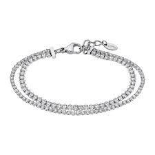 Pulsera Lotus Style para mujer fabricada en acero inoxidable formada por una doble cadena compuesta por circonitas blancas con cierre de mosquetón ajustable mediante cadena extensible.