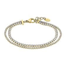 Pulsera Lotus Style para mujer fabricada en acero inoxidable bañada en oro amarillo formada por una doble cadena compuesta por circonitas blancas con cierre de mosquetón ajustable mediante cadena extensible.