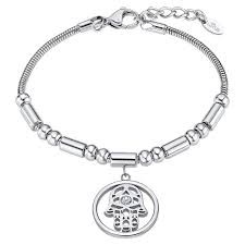 Pulsera Lotus Silver para mujer de la colección Millenial fabricada en plata compuesta por cadena y piezas tubulares que dan lugar a un colgante en forma de Mano de Fátima. Su cierre es de mosquetón ajustable mediante cadena extensible.