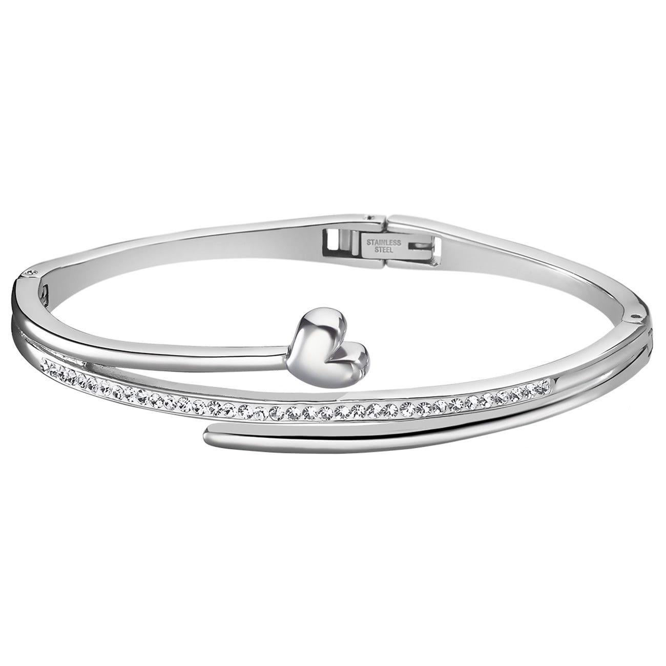 Pulsera en acero inoxidable 316L con motivo integrado corazón y pavé de cristal blanco. Cierre pato.